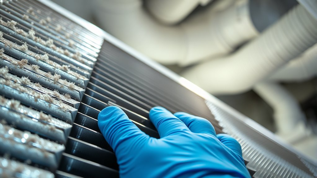 Regular maintenance of your air conditioner coils and ducts is essential for guaranteeing ideal performance and energy efficiency. One of the simplest yet most effective ways to maintain your system is through regular filter replacement. When you change your filters on schedule, you prevent dirt, dust, and debris from accumulating on the coils and inside the ductwork. A dirty filter restricts airflow, causing your system to work harder and consume more energy. By replacing filters every one to three months, depending on usage and filter type, you keep the air clean and your system running smoothly. This not only improves indoor air quality but also extends the lifespan of your AC components.