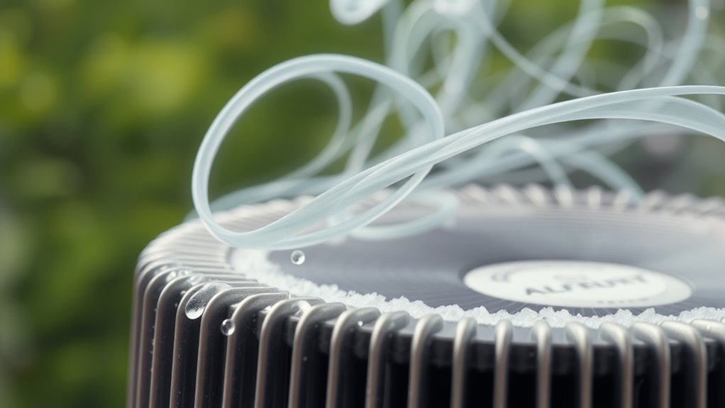 Refrigerant emissions directly contribute to ozone depletion because many contain chemicals like CFCs and HCFCs, which release chlorine and bromine atoms that break down ozone molecules. When you use an air conditioner with these refrigerants, leaks or improper disposal can lead to ozone layer damage. To minimize this impact, opt for eco-friendly refrigerants and guarantee regular maintenance to prevent emissions.