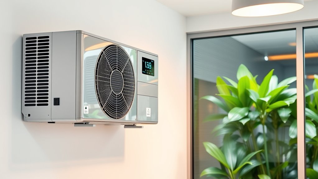 Heat pump systems help you manage indoor humidity by automatically adjusting moisture levels along with temperature control. They remove excess moisture through dehumidification, passing warm, moist air over cold coils to condense water. As humidity fluctuates, the system switches between dehumidifying and heating modes to keep your environment comfortable and dry. Equipped with sensors, these systems precisely regulate moisture, ensuring a healthy, cozy space. Continue exploring to discover how these advanced features work together seamlessly.