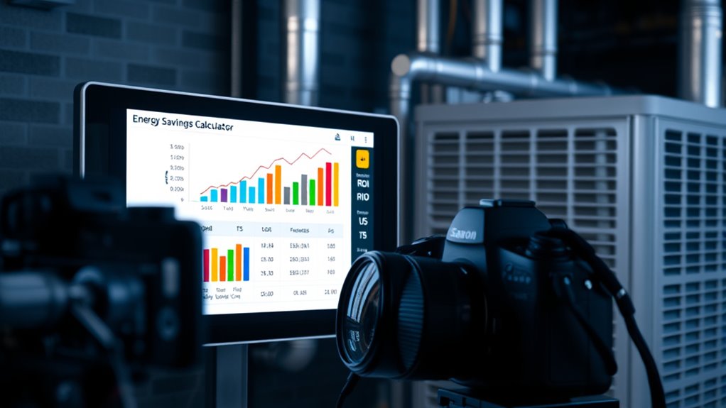 Energy savings calculators help you quickly estimate the potential financial and environmental benefits of switching to a heat pump. By inputting your current energy use, utility rates, and system details, you can see how much money you’ll save over time and how your carbon footprint could decrease. They also show payback periods, making it easier to plan your investment. Keep exploring to uncover more ways these tools can support your eco-friendly home upgrade plans.