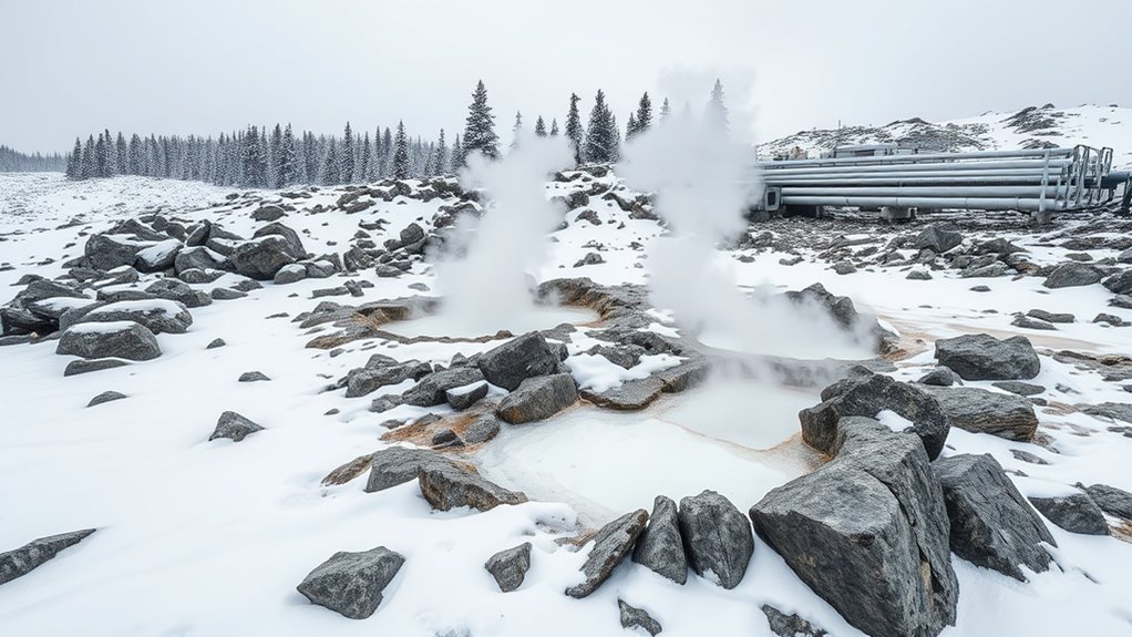 You might wonder how geothermal systems affect local ecosystems in cold environments. They can cause some ecosystem disruption, especially during installation, but generally, they have minimal long-term impacts. Biodiversity impact is usually low because geothermal systems rely on underground heat rather than surface changes. Proper planning and environmental assessments help guarantee that these systems coexist with the fragile cold-region ecosystems, protecting native plants and wildlife.