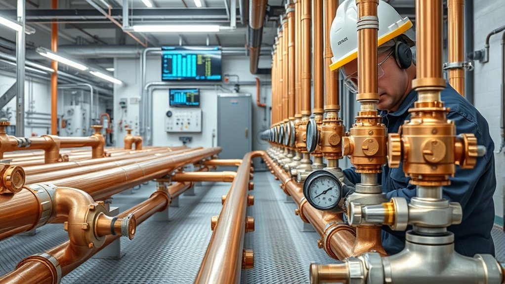 Additionally, focusing on system monitoring and diagnostics can help detect early signs of deterioration, allowing for timely intervention. Corrosion prevention is equally crucial. Since your geothermal system relies on buried pipes often made of metals like copper or steel, these materials are susceptible to corrosion over time. Corrosion can weaken your system’s components, leading to leaks, reduced efficiency, and eventually costly replacements. To prevent this, technicians often recommend installing corrosion inhibitors or using corrosion-resistant materials during installation. Regular inspections can also help catch early signs of corrosion, such as discoloration or small leaks. Applying protective coatings or sacrificial anodes can further shield your system’s components from corrosive elements, especially if your soil contains high mineral content or moisture levels that accelerate corrosion. Maintaining proper water chemistry is essential—improper pH levels or impurities can speed up corrosion processes. Ensuring your system’s water is balanced and free of corrosive contaminants can considerably prolong its operational life.