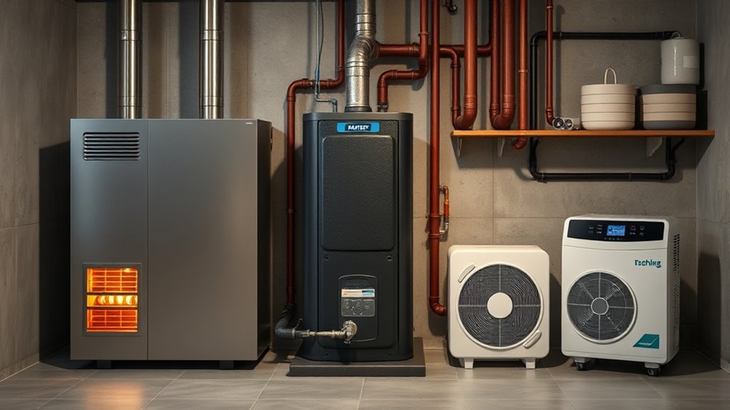 Choosing between furnaces, boilers, and heat pumps depends on your budget, climate, and energy goals. Furnaces are typically more affordable to install and provide fast heat, ideal for quick warming. Boilers offer steady, quiet heat and work well in colder climates, while heat pumps are energy-efficient and can cool your home too. To understand which system best suits your needs and long-term savings, explore the details you’ll find below.