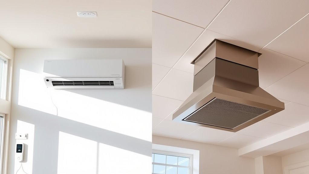 Ultimately, choosing between ductless and ducted systems depends on your home’s needs and your preferences. Ductless units offer flexibility and easy installation, making them perfect for retrofit projects. Ducted systems, on the other hand, provide consistent heating for larger spaces and central control. Think of it like finding the right rhythm—sometimes, a smooth, unified beat (ducted) works best, while other times, individual melodies (ductless) suit your style better. Consider your home’s layout and comfort priorities to make the right choice.