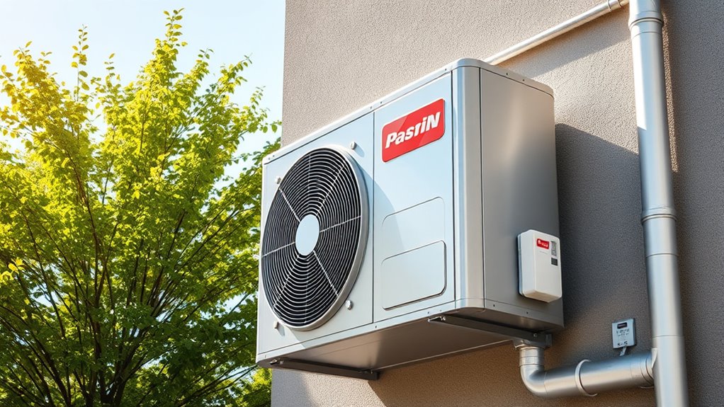 Implementing heat pumps also encourages a shift toward smarter, more integrated energy systems. Because they use electricity, you can control and optimize their operation through smart grids and home automation. This means your system can adapt to fluctuating renewable energy availability, maximizing efficiency and minimizing emissions. As the electricity grid becomes greener, the environmental benefits of heat pumps grow even more substantial. Your role in this transition is essential—you can choose to install systems that support renewable integration, making your building more resilient and aligned with decarbonization goals.