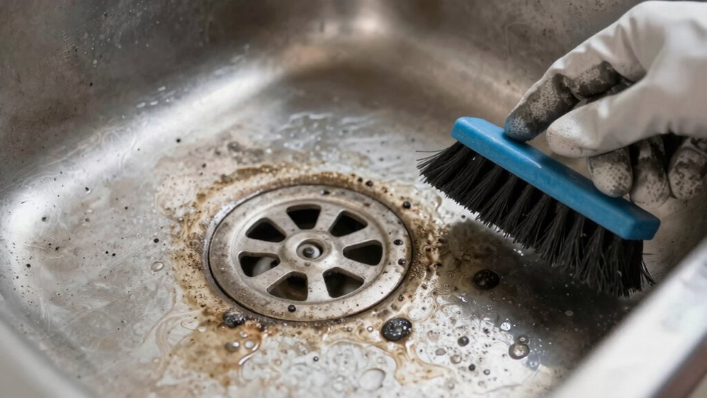 To prevent mold buildup in your drain pan, prioritize regular drain pan maintenance by cleaning it weekly with a mixture of vinegar and water. Make sure you remove standing water promptly and dry the area thoroughly after cleaning. Mold prevention relies on controlling moisture, so keep the drain pan dry and well-ventilated. Sealing any leaks and inspecting it regularly also help maintain a mold-free environment, protecting your home from water damage.