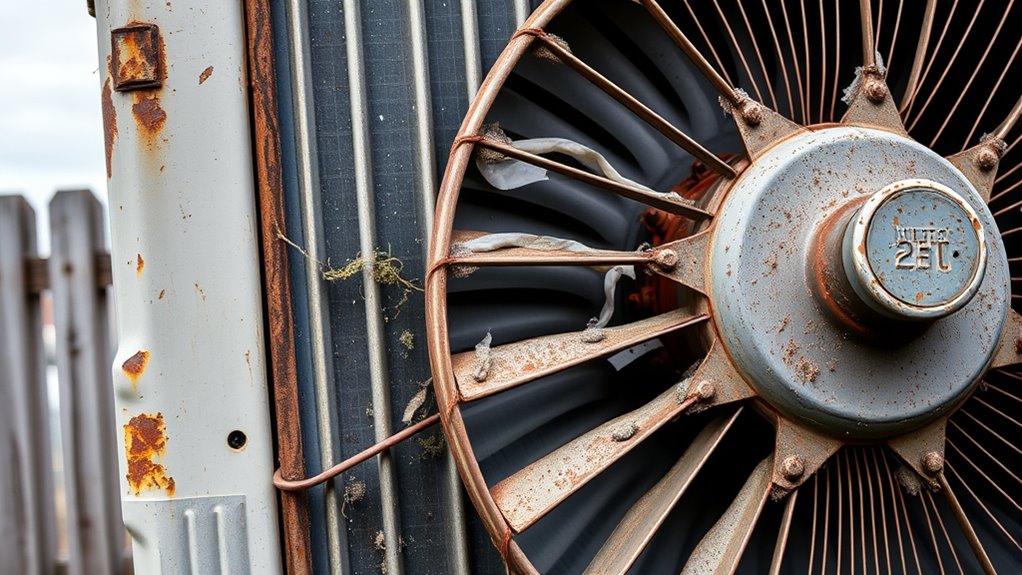 If your heat pump is over 10-15 years old, it’s likely nearing the end of its lifespan. Signs you should consider replacement include rising energy bills despite consistent use, frequent repairs, inconsistent heating or cooling, strange noises, or increased indoor humidity. Older units often lose efficiency and support for newer refrigerants or smart controls. Recognizing these signs early can help you avoid costly breakdowns—discover more about how to identify these issues below.