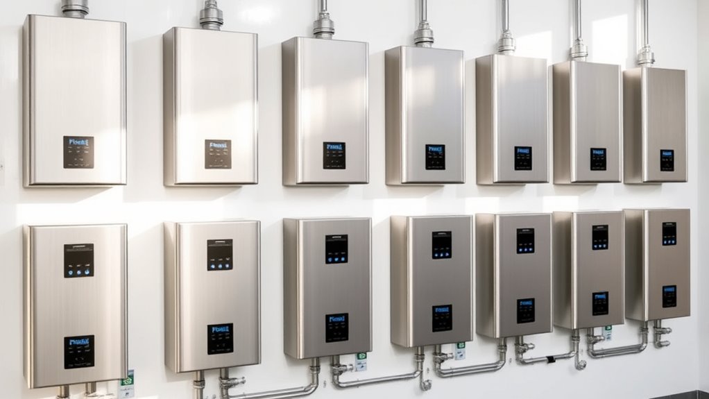 Selecting the right 10 GPM gas tankless water heater requires careful attention to space and installation factors. First, check that the unit’s dimensions fit your designated area, leaving enough clearance for maintenance, venting, and airflow. Determine whether the heater is suitable for indoor or outdoor installation, and ensure it’s compatible with your existing venting system or if additional components are needed. Review available mounting options—wall brackets or outdoor kits—to match your home’s structure. Confirm that water and gas inlet/outlet sizes align with your plumbing and gas lines for smooth setup. Finally, consider space for auxiliary components like recirculation pumps or WiFi modules, making sure they won’t overcrowd your installation space. Proper planning guarantees a seamless, safe installation process.