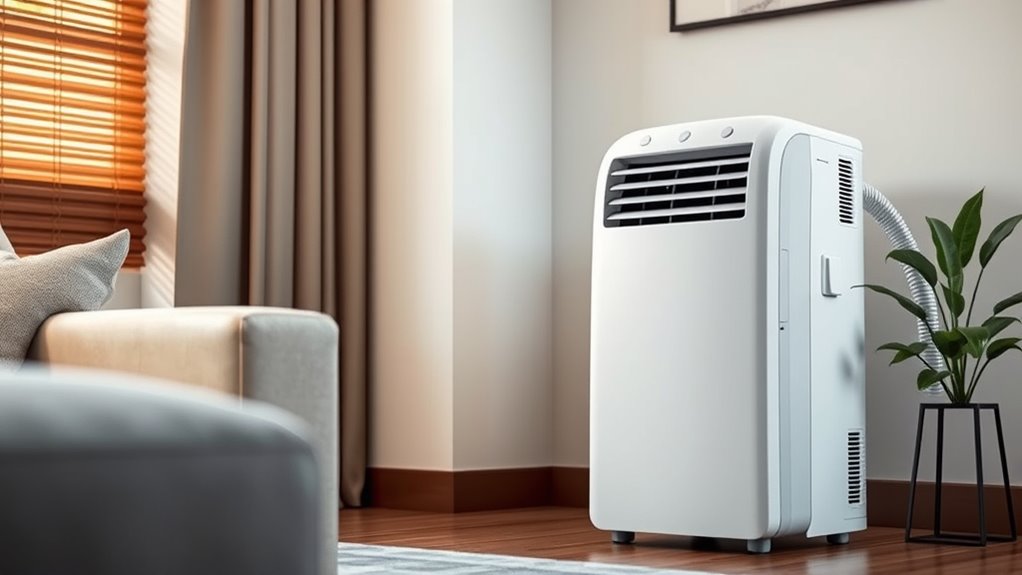 Energy efficiency is a crucial factor to take into account because it directly impacts your long-term energy bills and environmental footprint. I recommend looking for units with inverter technology, which can save up to 40% energy compared to traditional compressors. Models with automatic evaporation or self-evaporating systems help reduce water drainage and boost efficiency. Programmable timers and sleep modes are also valuable, allowing you to minimize energy use during off-peak hours. Smart control features, like remote adjustment and scheduling, promote more efficient operation, especially if you want to manage your AC remotely. Finally, check the energy efficiency ratio (EER) or seasonal energy efficiency ratio (SEER) ratings to ensure the unit meets high standards for energy savings. Prioritizing these features will save you money and reduce your environmental impact.