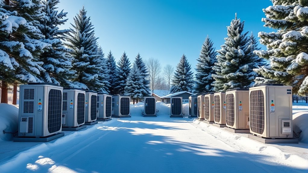 3-ton heat pumps can perform well in cold climates, especially newer models with advanced cold-weather technology. I’ve found that they efficiently heat my home even when temperatures drop below freezing. However, in extremely harsh conditions, I recommend pairing them with a backup heat source to guarantee consistent warmth. Overall, modern 3-ton heat pumps are a reliable choice, providing comfort and energy efficiency in colder environments.