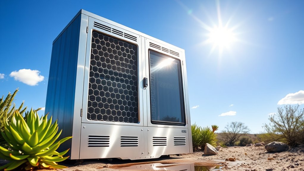 Choosing the right evaporative cooler for dry climates requires understanding several key factors. These coolers excel in areas with low humidity, typically below 60%, where evaporation effectively lowers temperatures. In such environments, they can reduce indoor temperatures by up to 36-49°F, making them highly efficient. However, in humid conditions, their performance drops markedly because the high moisture content hampers evaporation. Proper ventilation is vital; cross-ventilation ensures a steady flow of fresh air, maximizing cooling efficiency. Conversely, in environments with high humidity or limited airflow, evaporative coolers can cause excess moisture buildup, leading to mold growth and reduced effectiveness. Thus, evaluating local climate conditions, humidity levels, and airflow potential is essential to determine if an evaporative cooler will work well in a specific dry climate.