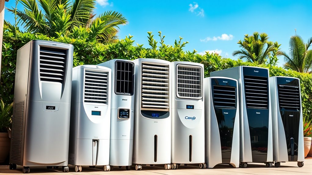 If you’re looking for the best evaporative coolers to stay cool all summer, I recommend options with high airflow, portability, and versatile features like app control and oscillation. Units like the Hessaire MC37M and NOMEY offer powerful cooling, while others provide multi-functionality for indoor or outdoor use. Consider size, water capacity, and climate compatibility to find your perfect fit. Keep going, and you’ll discover which cooler matches your needs perfectly.