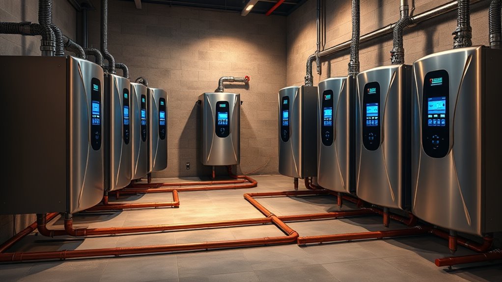 High-efficiency gas boilers markedly boost my energy savings by using less fuel to produce the same heat. I’ve noticed lower utility bills and a smaller carbon footprint since upgrading. Their advanced technology, like condensing systems, captures more heat from exhaust gases, making them more efficient. Overall, they’re a smart investment that pays off through reduced energy costs and helps me contribute to a greener environment.