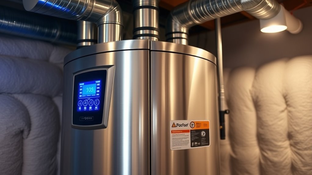 In 2025, gas furnaces are rated with AFUE (Annual Fuel Utilization Efficiency) scores, typically ranging from 90% to over 98%. Higher ratings mean better energy efficiency, saving you money on heating bills. I recommend choosing a furnace with an AFUE of at least 95% for maximum savings and performance. Always check the labels and specifications before buying to guarantee you’re getting a model that maximizes energy use and minimizes waste.