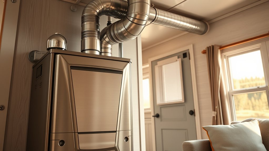 Ensuring your gas furnace’s venting system is compatible with your mobile home’s setup is essential for safe and efficient operation. You need to verify that the venting type matches your existing configuration, whether it’s direct vent, natural vent, or sealed combustion. Check that the materials and diameter of the venting system meet the manufacturer’s specifications to prevent leaks or backdrafting, which could pose safety risks. Consider whether the furnace supports venting through walls or ceilings, depending on your home’s construction and space constraints. Additionally, confirm that the venting system is rated for your furnace’s BTU output and complies with local building codes and safety standards. Features like pressure switches or draft inducers also play a critical role in maintaining safe and efficient venting.