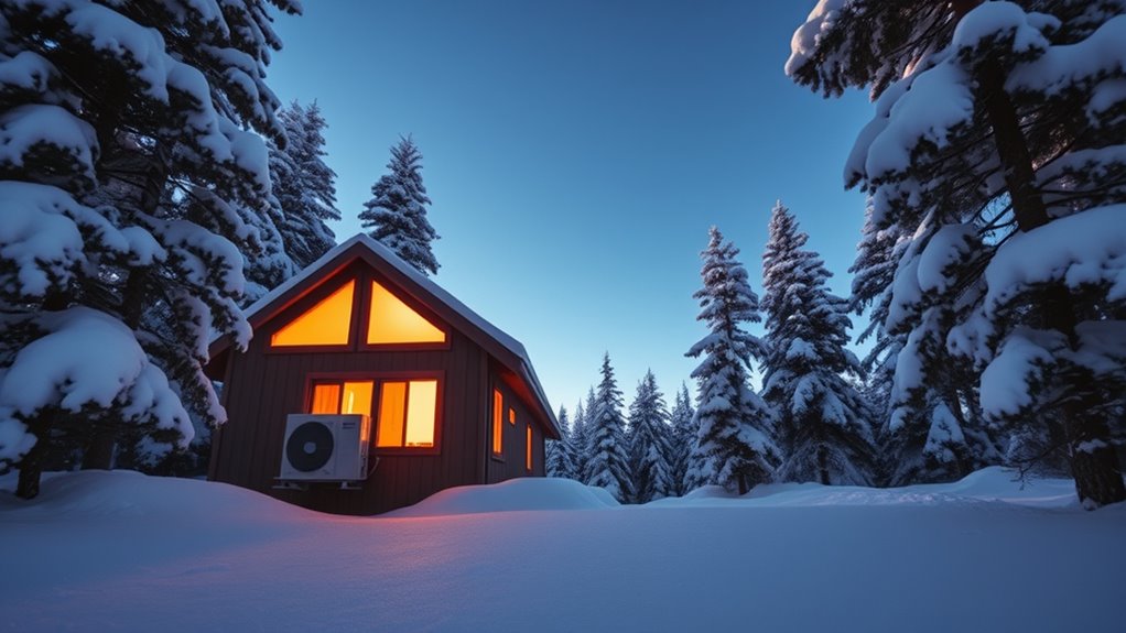 Heat pumps can perform well even in extremely cold temperatures, especially modern models designed for cold climates. I’ve found that high-quality units can effectively heat my off-grid cabin down to -15°F or lower, thanks to advanced technology like variable-speed compressors and enhanced refrigerants. However, in very harsh conditions, I recommend supplementing with a backup heat source to guarantee consistent warmth and energy efficiency during prolonged cold spells.