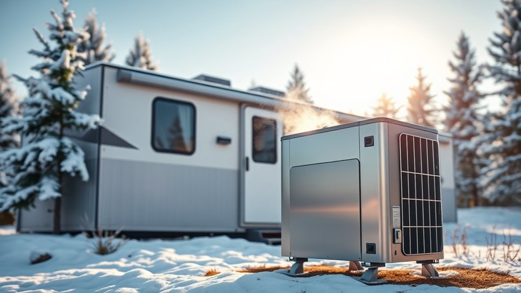 Ensuring your heat pump is suitable for your mobile home’s climate is essential for reliable comfort and efficiency. First, check that the unit has the right heating capacity (measured in BTUs) for your climate zone and home size—too small, and it won’t keep you warm; too large, and it’ll cycle inefficiently. Pick a model with a wide operational temperature range to handle extreme cold or heat. High energy efficiency ratings like SEER and HSPF are important to keep energy costs down, especially in demanding climates. For cold regions, advanced defrost features prevent ice buildup and ensure consistent performance. Finally, confirm that the heat pump can operate reliably in your specific humidity levels and temperature extremes for year-round comfort.
