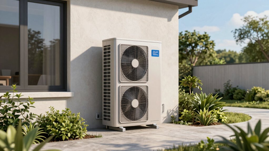 When selecting a mini split heat pump for a manufactured home, durability and weatherproofing are essential considerations to guarantee long-term performance. I look for units built from galvanized steel with powder coating, as these materials resist corrosion and withstand harsh outdoor conditions. Features like sealed electrical connections and protective coverings prevent moisture, snow, and debris from damaging internal components. Reinforced brackets and vibration dampers help minimize wear caused by outdoor environmental stressors. Proper installation elevation supported by heavy-duty mounting brackets is vital to prevent contact with standing water or flooding, boosting weather resistance. High-quality weatherproofing not only shields the system from environmental damage but also extends its lifespan by protecting against rust, corrosion, and other stressors that can impair performance over time.