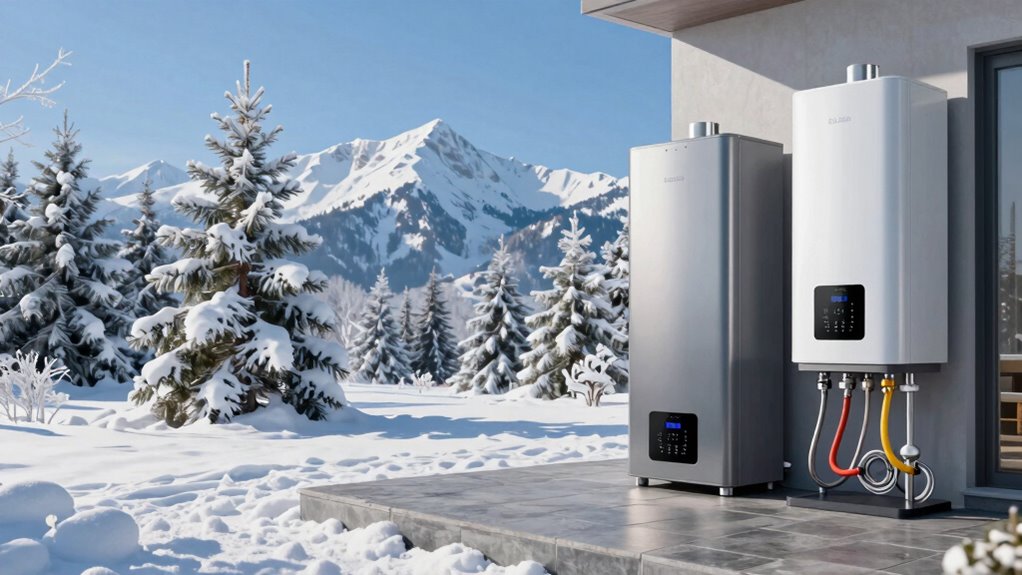 Did you know some models can operate efficiently in temperatures as low as -30°F? Yes, there are specific tankless water heaters designed for freezing conditions. I recommend looking into units with built-in freeze protection and insulation, like the Noritz NRC111DV or Rheem RTGH-95DVN. These models are built to withstand extreme cold, ensuring you always have hot water without worries, even during the harshest winters.