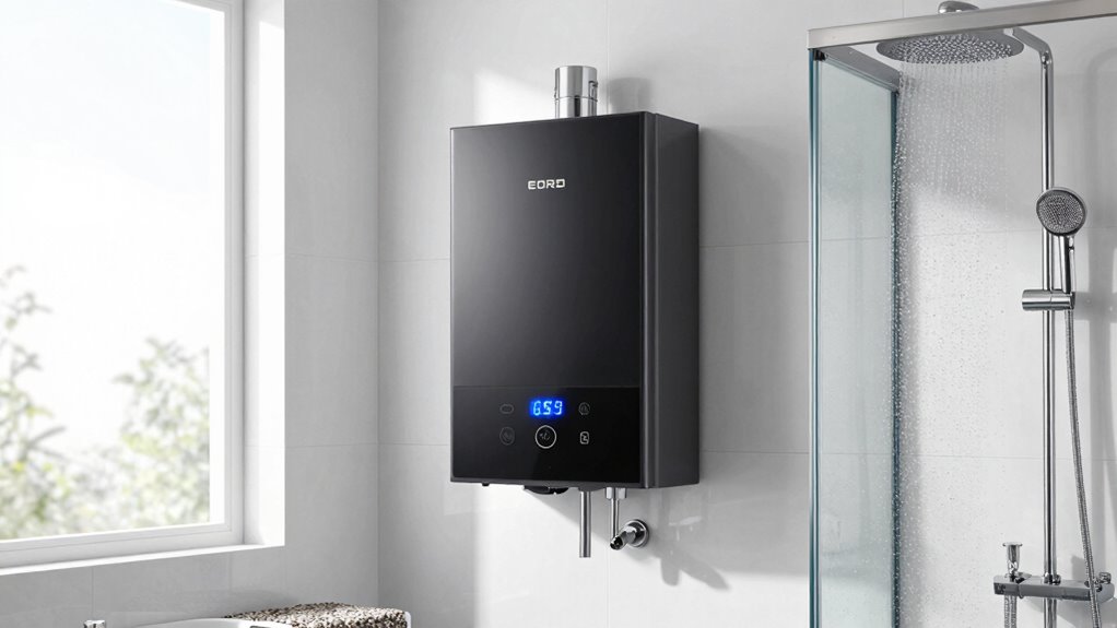 In hard water conditions, I recommend regularly flushing your tankless water heater with a descaling solution to prevent mineral buildup. I also check the filters and replace them if they’re clogged. It’s essential to schedule annual maintenance with a professional to inspect the system, flush out any sediment, and guarantee everything runs efficiently. Staying proactive with these steps keeps your heater working smoothly and extends its lifespan.